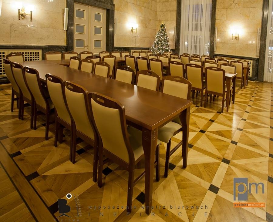 Nam przypadło w udziale umeblowanie tego miejsca – pełnego własnego stylu, przepychu i historii. Szukaliśmy motywu przewodniego, który połączy stare z nowym. Inspiracją okazały się małe, ale bardzo charakterystyczne motywy dekoracyjne, czyli spirale przypominające ślimaczki, znajdujące się na ścianach sali. Zdecydowaliśmy powtórzyć ten wzór na krzesłach oraz stołach, tak aby wszystkie elementy tworzyły spójną całość. Musieliśmy pamiętać o zaleceniu inwestora, zgodnie z którym ustawienie i zastosowanie wyposażenia musiało być zmienne w zależności od potrzeb.