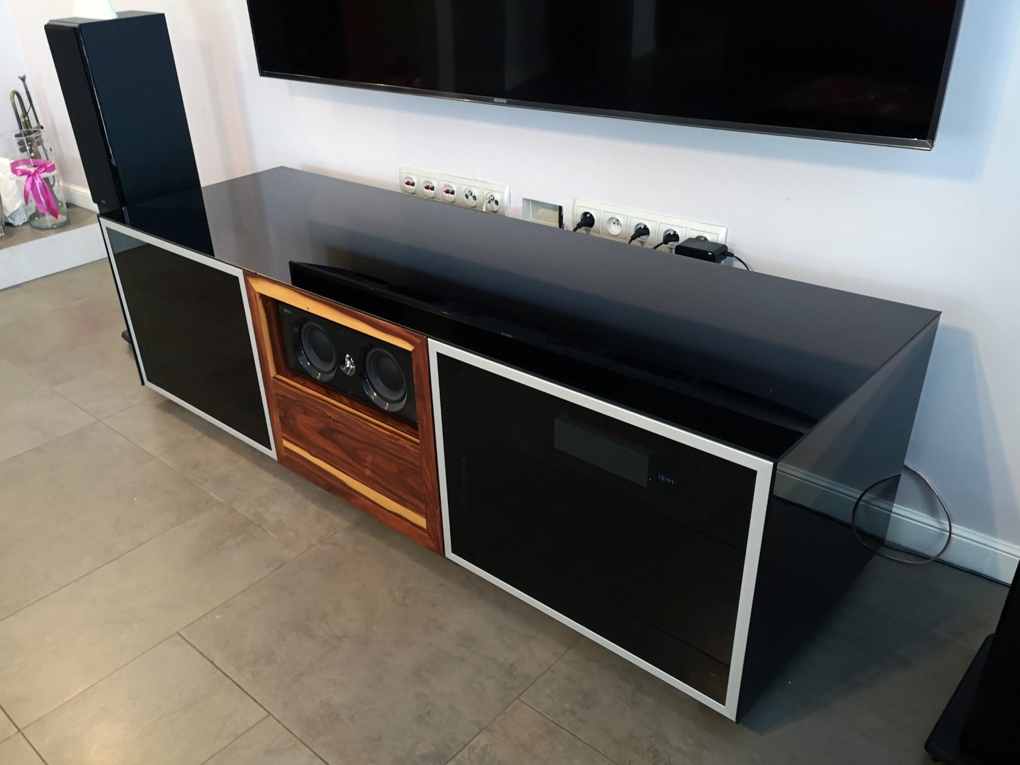 Meble fornirowane do domu prywatnego. Szafa z drzwiami lamelowymi z drewna sosnowego- lakierowanego. Projekt i realizacja. Stół rozkładany.