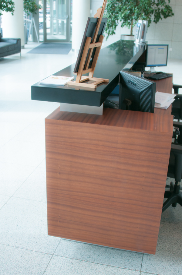 Wyzwanie; Zabudowa recepcji w dużym budynku biurowym w Warszawie. Obok tej lady dziennie przechodzi kilka tysięcy ludzi, wielu zatrzymuje się aby coś załatwić. Mebel w takim miejscu musi być reprezentacyjny, elegancki, funkcjonalny i odporny na zużycie.