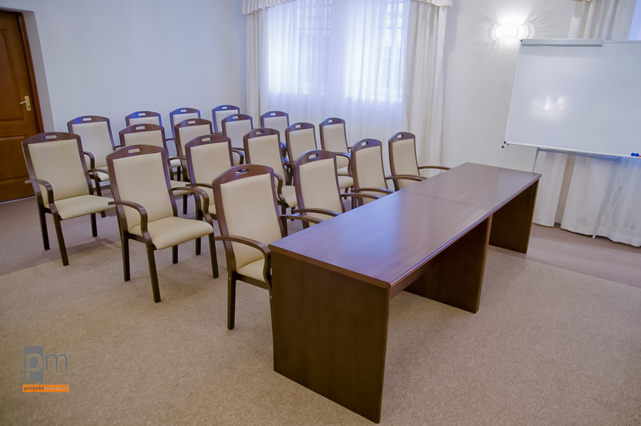 Realizacja: Wybraliśmy krzesła podobne do tych, których użyliśmy w innej realizacji Projektmebla – Sali Marmurowej w gmachu Sejmu Śląskiego w Katowicach. Są to stabilne meble, które będą służyły temu miejscu przez wiele lat. Odporne na zużycie krzesła obite są materiałem, który wygląda jak tradycyjna tapicerka. W rzeczywistości jednak pokryty jest miłą w dotyku zmywalną powłoką. Pomimo zastosowanego kremowego koloru, nie musimy obawiać się zanieczyszczeń – łatwo je usuniemy, nawet za pomocą wody (powłoka zapobiega wchłanianiu płynów).