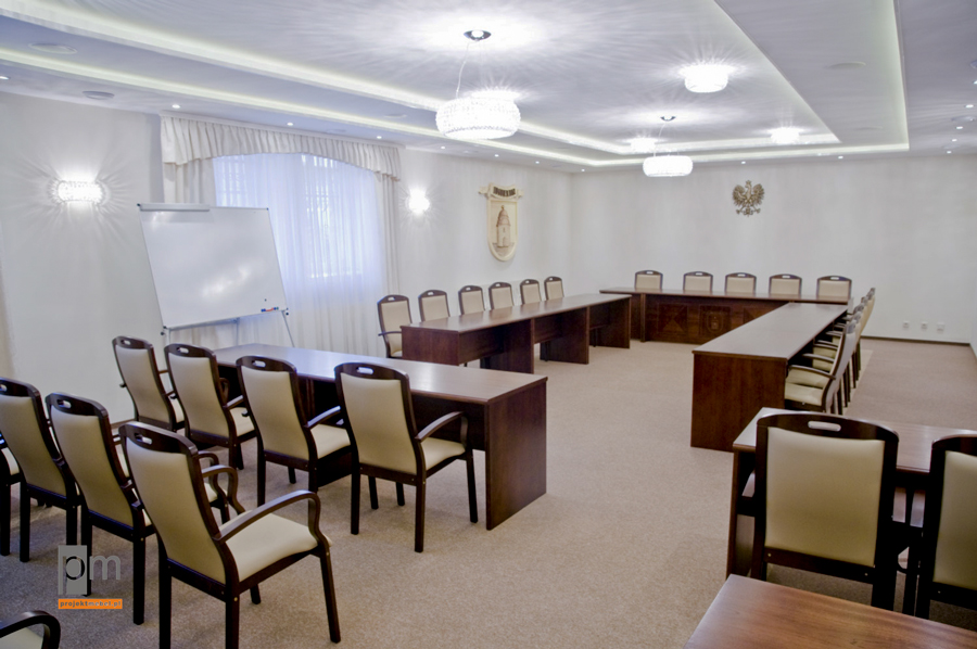 Ostateczny wygląd sali sesyjnej to w pełni nasz projekt – jedynie logotyp miasta umieszczony na ścianie to dzieło innego wykonawcy. Kompleksowo zaprojektowaliśmy wszystkie meble i szczegóły sali: zaczynając od stołów i krzeseł, poprzez wykładzinę i tapicerki, aż po oświetlenie.